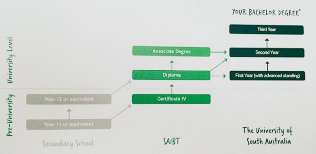 - Bằng cấp SAIBT là con đường dẫn đến hầu hết các bằng cử nhân tại Đại học Nam Úc (UniSA). Khi hoàn thành thành công bằng cấp SAIBT của bạn, bạn sẽ đủ điều kiện để tham gia vào một loạt các chương trình cấp bằng cử nhân tại UniSA.
