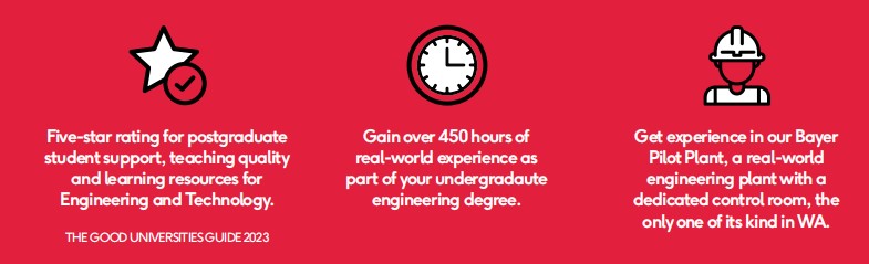 Là ngành học nền tảng của Murdoch, được thiết kế với nhiều giờ thực tập xuyên suốt quá trình học. Các khóa học về kỹ sư của trường được sinh viên quốc tế đánh giá cao về chất lượng giáo dục và chi phí hợp lý.