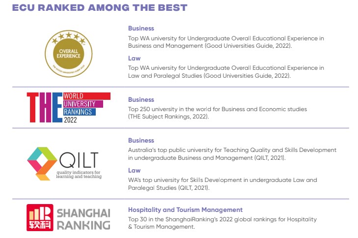Ngành Luật: Theo 2020 QUILT Student Experience Survey, ECU được công nhận là một trong các trường công lập tại Tây úc đạt chất lượng hàng đầu trong giảng dạy, phát triển kỹ năng ở nhóm ngành Luật.